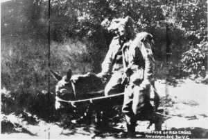 Many of Simpson’s biographers make reference to the fact that, tall strong lad that he was, he was an ideal stretcher-bearer. That was his allotted task. “Stretcher bearer” suggests some degree of organisation and support but in fact conditions were so chaotic, and casualties so high, that the bearers often had to make a dash under fire to carry the wounded back over their shoulders. Shortly after Simpson’s arrival he found one of the donkeys that had arrived with the water bearers and, with a makeshift halter made from a bandage, took the animal to help him carry the wounded back.