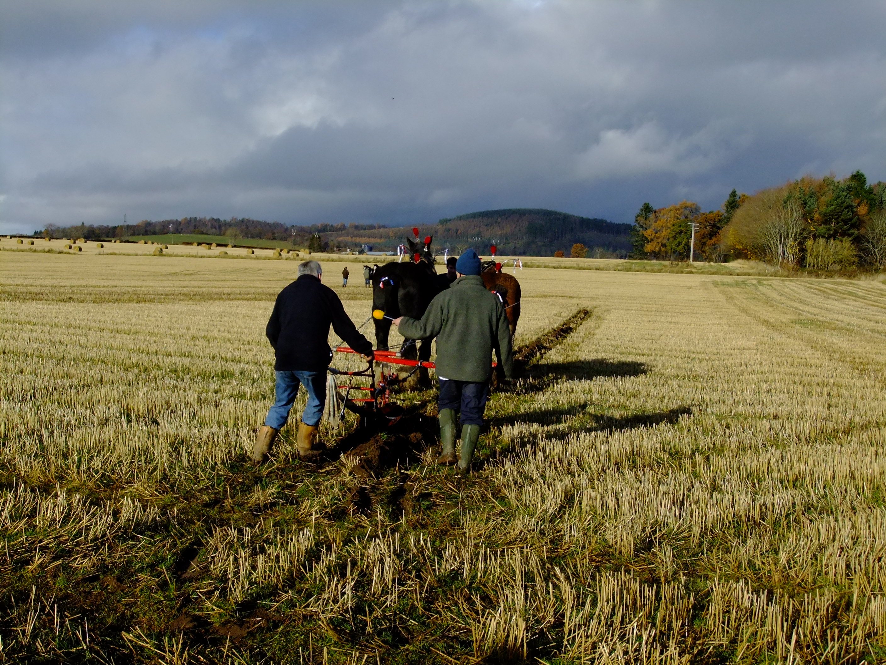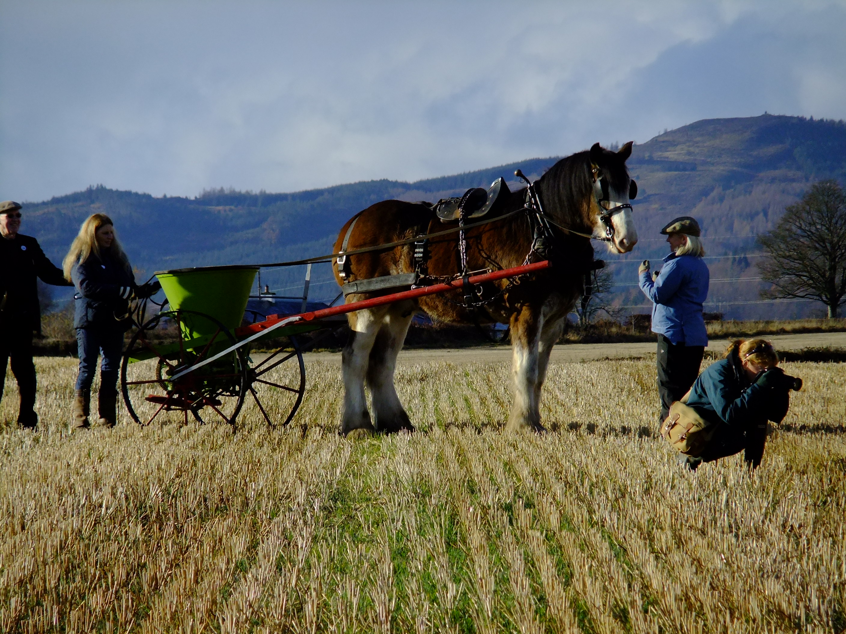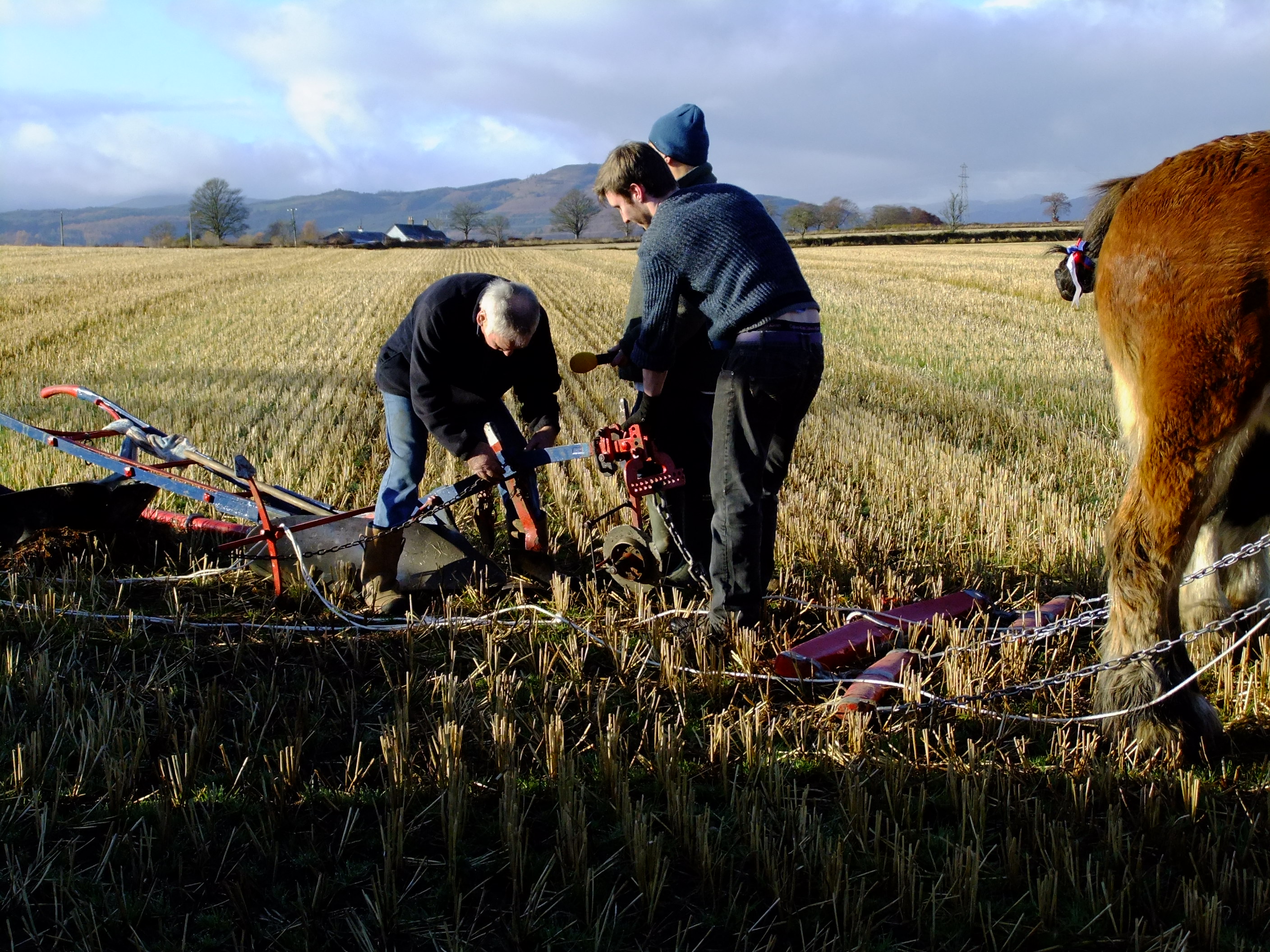 The ploughman and his horses would once have worked silently and in isolation in this landscape, moving back and forth steadily and slowly in march with the seasons. Today, though, he is accompanied by a lively and informative commentary coming over a speaker system to an enthusiastic crowd who are watching him at work. It’s the 17th of November 2012 and we’ve come from all over Scotland to observe, learn and perhaps apply some of the knowledge and skills that are on display here at this Working Horse Day organised by the British Horse Society (BHS Scotland).