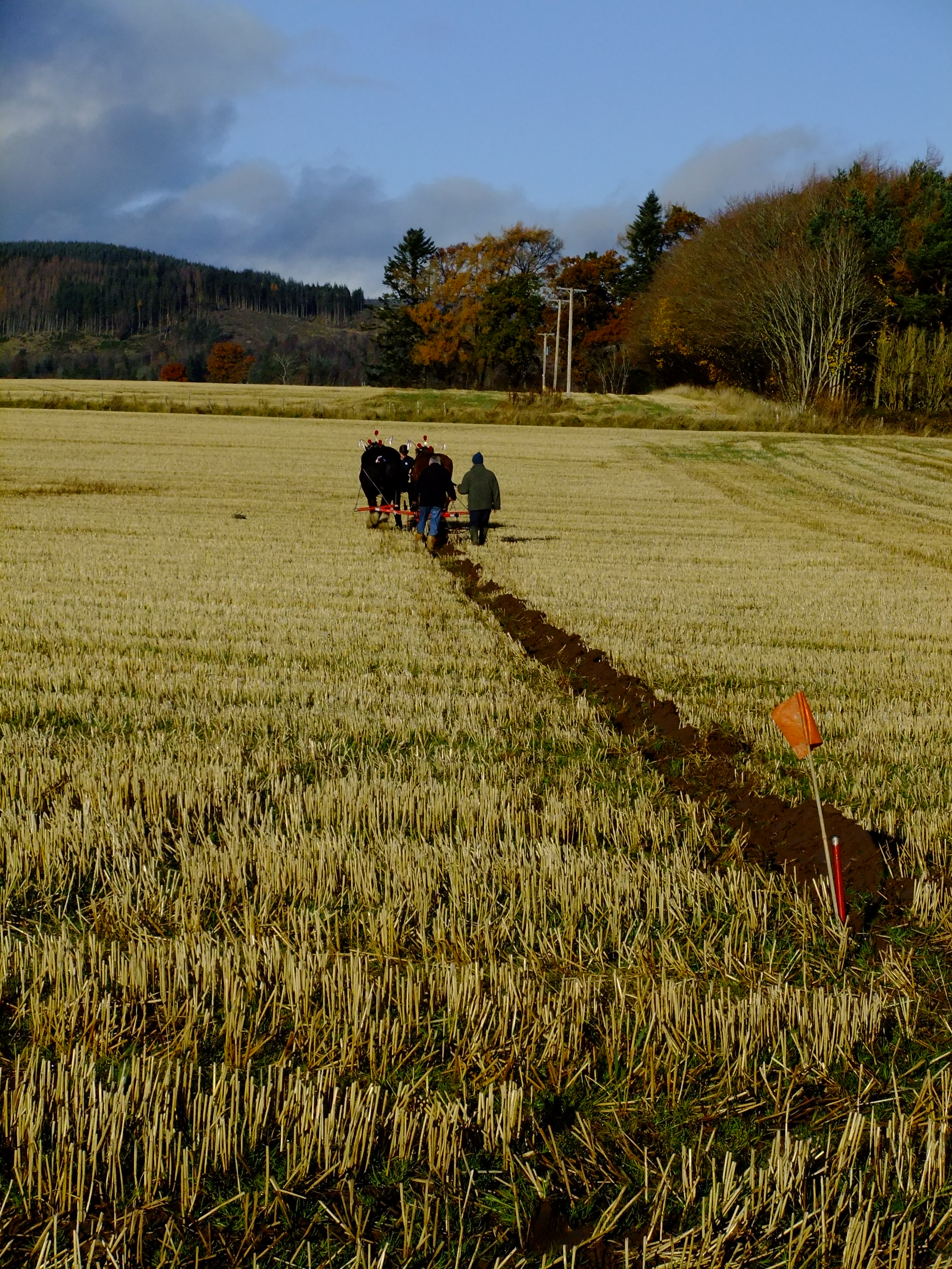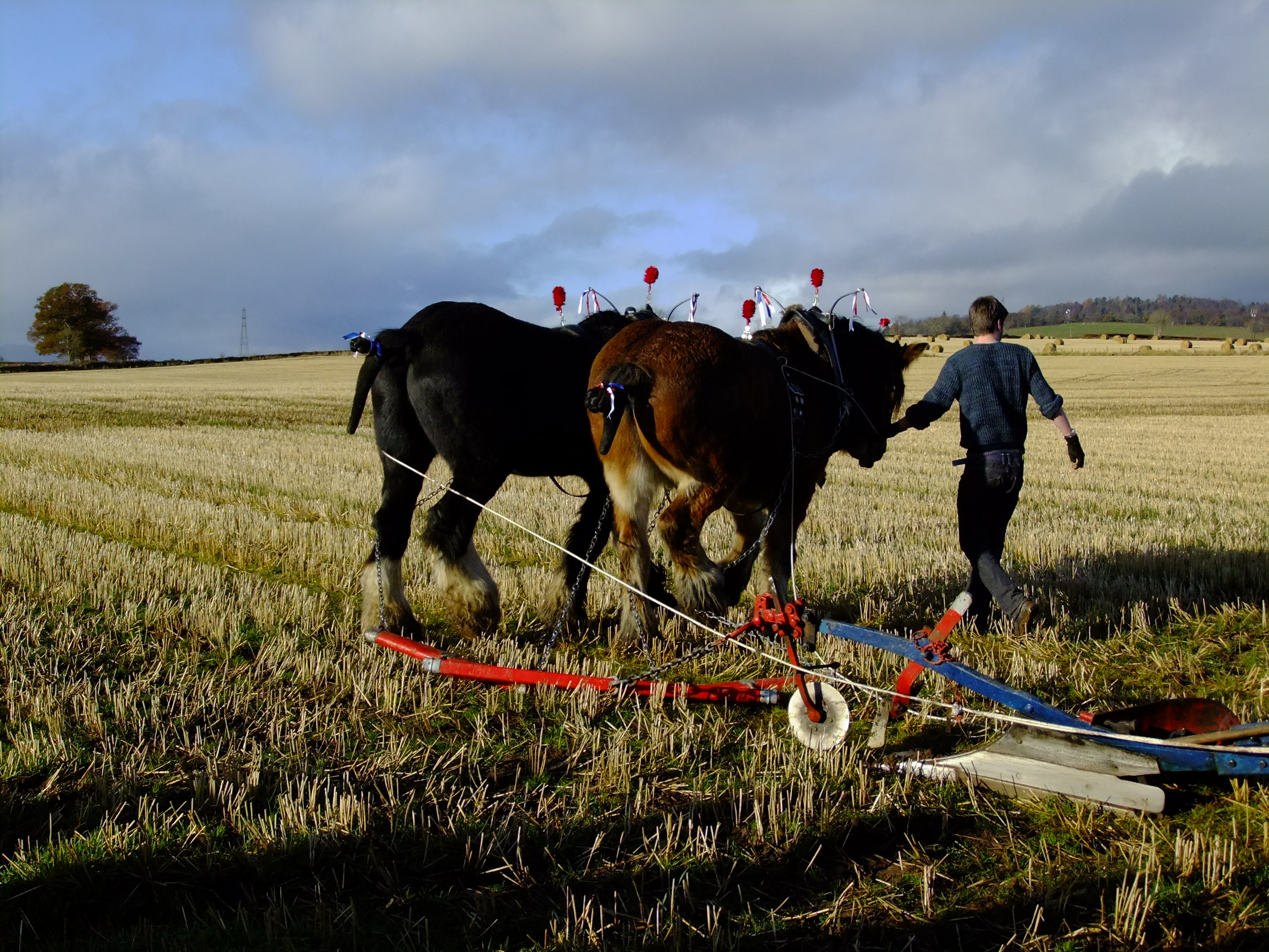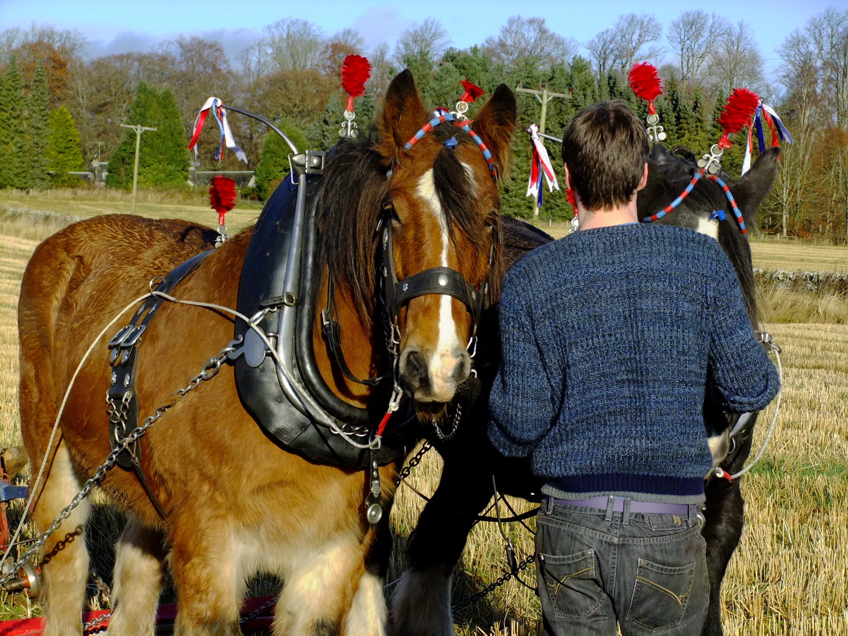 The ploughman and his horses would once have worked silently and in isolation in this landscape, moving back and forth steadily and slowly in march with the seasons. Today, though, he is accompanied by a lively and informative commentary coming over a speaker system to an enthusiastic crowd who are watching him at work. It’s the 17th of November 2012 and we’ve come from all over Scotland to observe, learn and perhaps apply some of the knowledge and skills that are on display here at this Working Horse Day organised by the British Horse Society (BHS Scotland).
