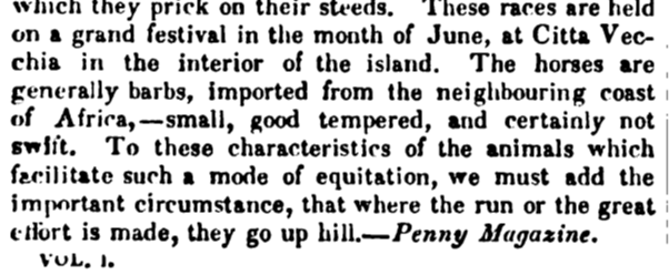 However, whoever the author of this section might be, they go on to say: “We proceed to notice a little more particularly some of the more prominent kinds of British horses. In doing so, we shall chiefly follow the ‘Treatise on the Horse,’ published in the Library of Useful Knowledge”. This is the Youatt volume, but since it doesn’t specify which one, I’m still no further on. However, I do some double-checking just to be sure, by cross-checking entries between the Goldsmith volume and my own edition of Youatt.
