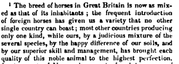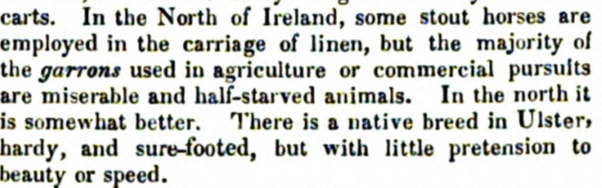 And so I continue reading the giant footnote, which is clearly mostly Youatt, reminding myself that it is a footnote and not the main text, going through the various breed descriptions, until that section appears to come to an end, with a snarky and uncalled for comment on the horses of Ulster: