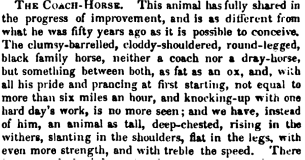 In Youatt from 1843 we have the very similar: “This animal in external appearance is as different from what he was fifty years ago as it is possible to conceive. The clumsy -barrelled, cloddy-shouldered, round-legged, black family horse – neither a coach nor a dray-horse, but something between both – as fat as an ox — but, with all his pride and prancing when he first starts not equal to more than six miles an hour, and knocking-up with one hard day’s work, is no more seen ; and we have, instead of him , an animal as tall, deep -chested, rising in the withers, slanting in the shoulders, flat in the legs, with far more strength, and with treble the speed”.