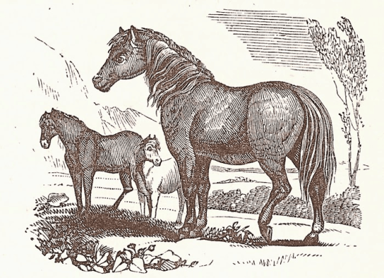 The image was published along with the text that accompanied it in the source, which Brian Moffat cited as Oliver Goldsmith’s Natural History, since he’d apparently found it in his own copy of that book. He did, however, point out that the text appeared to be later than Goldsmith’s original work, but not how much later, nor who might have written it. Readers will search in vain for either the image or the text in Goldsmith’s early editions: it is not there. However, sharp-witted equine history researchers with an interest in unusual horse breeds will immediately spot the source of the text on the Falling Angels, Lost Highways page as William Youatt, the prolific nineteenth century author of animal husbandry texts: